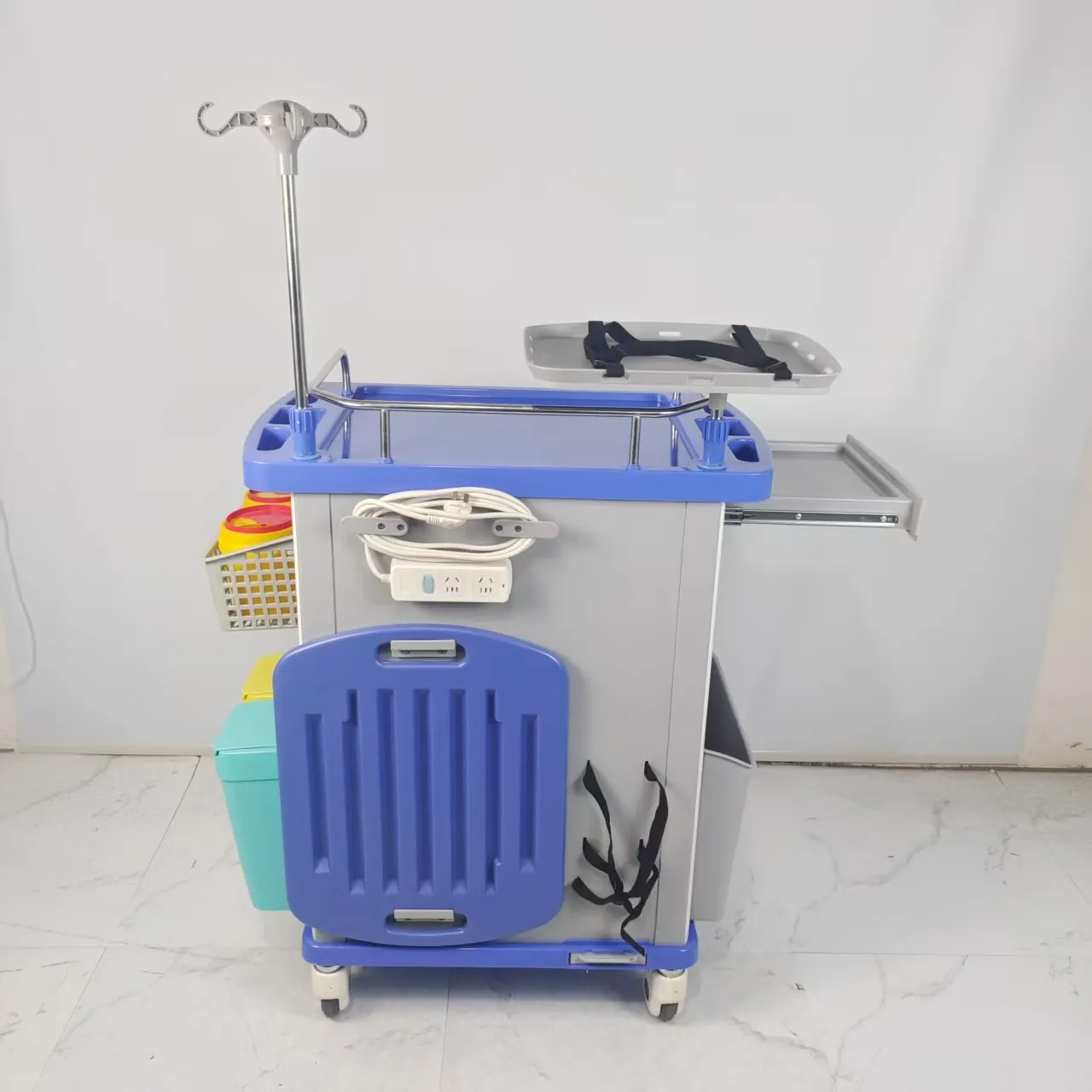 - Dust Basket: The dust basket of the anesthesia cart is designed with a thoughtful and practical approach, incorporating two distinct colors to facilitate the sorting of medical waste. This intuitive design enables efficient segregation of waste materials, contributing to a hygienic and organized environment within healthcare facilities. By utilizing color-coding, healthcare professionals can easily differentiate between different types of waste, ensuring proper disposal practices and compliance with waste management regulations. This feature demonstrates a commitment to promoting a safe and clean working environment, aligning with the high standards of sanitation and waste management in medical settings.