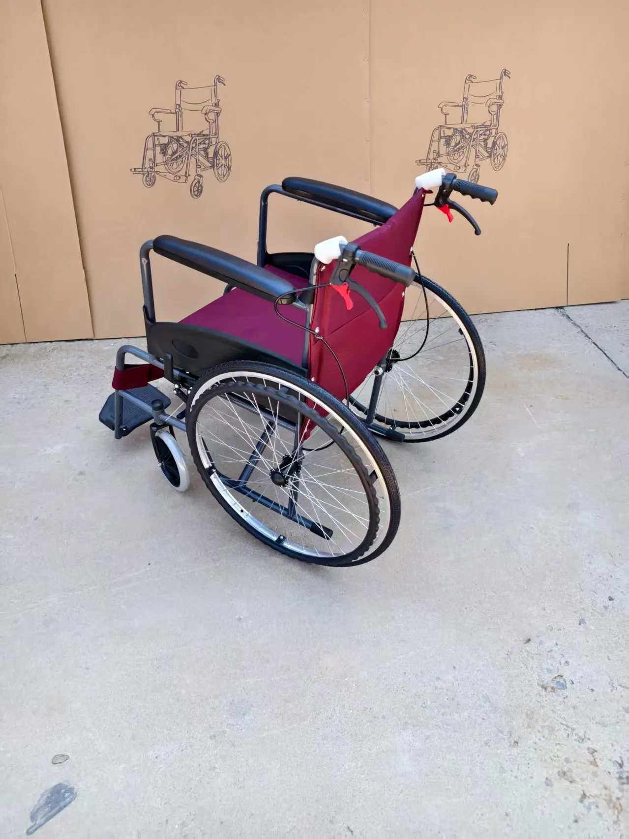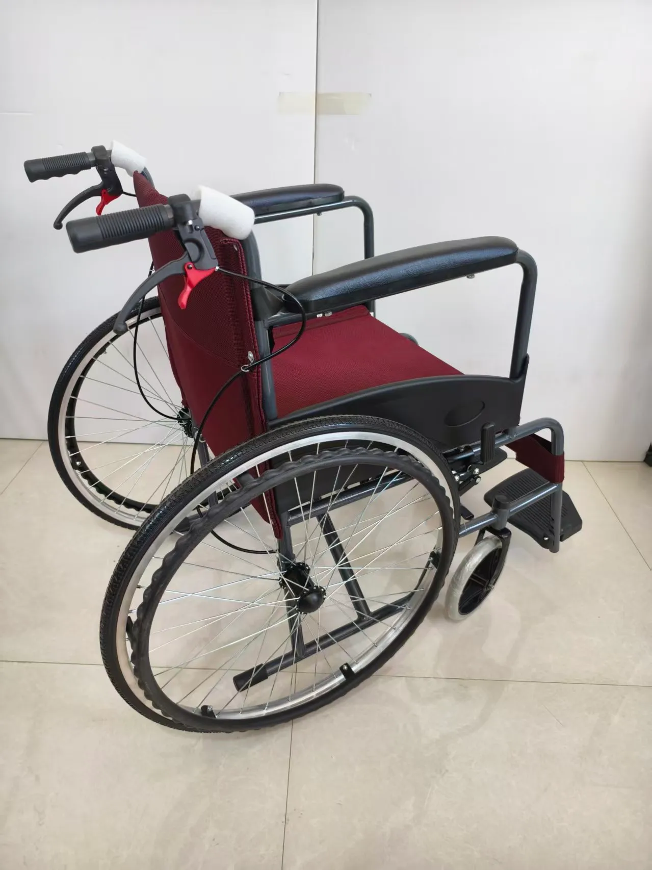 เบรก: เบรกสี่ตัวที่ด้านบนและด้านล่าง เบรกบำรุงรักษาด้านบนสองตัว และเบรกจอดล่างสองตัว คุณสมบัติ: แผ่นป้องกันครึ่งวงกลมพลาสติกพร้อมที่วางแขนหนังฟองน้ำหนานุ่มคุณภาพสูง โครงสร้างรองรับก้านไม้กางเขนเดี่ยว แหวนมือหนาพิเศษ