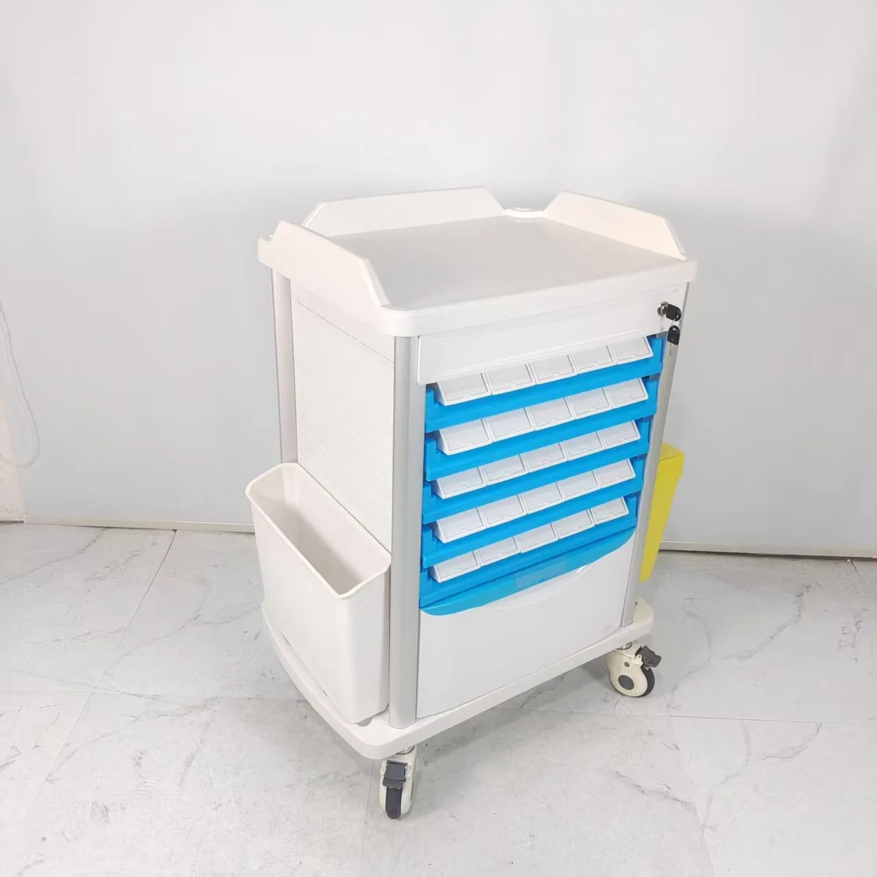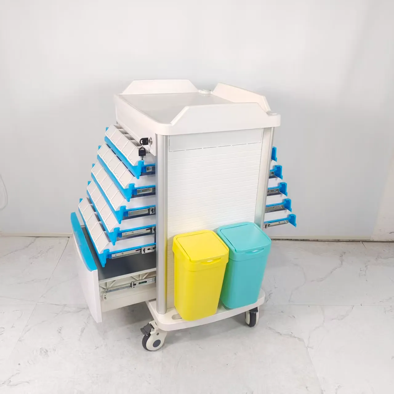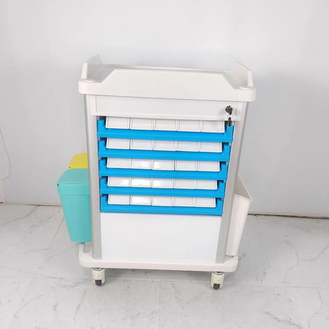 • ตะกร้าเก็บฝุ่น: ตะกร้าเก็บฝุ่นของรถเข็นดมยาสลบได้รับการออกแบบด้วยความรอบคอบและใช้งานได้จริง โดยผสมผสานสองสีที่แตกต่างกันเพื่ออำนวยความสะดวกในการคัดแยกขยะทางการแพทย์ การออกแบบที่ใช้งานง่ายนี้ช่วยให้สามารถแยกขยะได้อย่างมีประสิทธิภาพ ทำให้เกิดสภาพแวดล้อมที่ถูกสุขลักษณะและเป็นระเบียบภายในสถานพยาบาล การใช้รหัสสีช่วยให้ผู้เชี่ยวชาญด้านสุขภาพสามารถแยกแยะระหว่างขยะประเภทต่างๆ ได้อย่างง่ายดาย ช่วยให้มั่นใจได้ถึงแนวทางปฏิบัติในการกำจัดที่เหมาะสมและการปฏิบัติตามกฎระเบียบด้านการจัดการขยะ คุณลักษณะนี้แสดงให้เห็นถึงความมุ่งมั่นในการส่งเสริมสภาพแวดล้อมการทำงานที่ปลอดภัยและสะอาด ซึ่งสอดคล้องกับมาตรฐานระดับสูงด้านสุขอนามัยและการจัดการของเสียในสถานพยาบาล