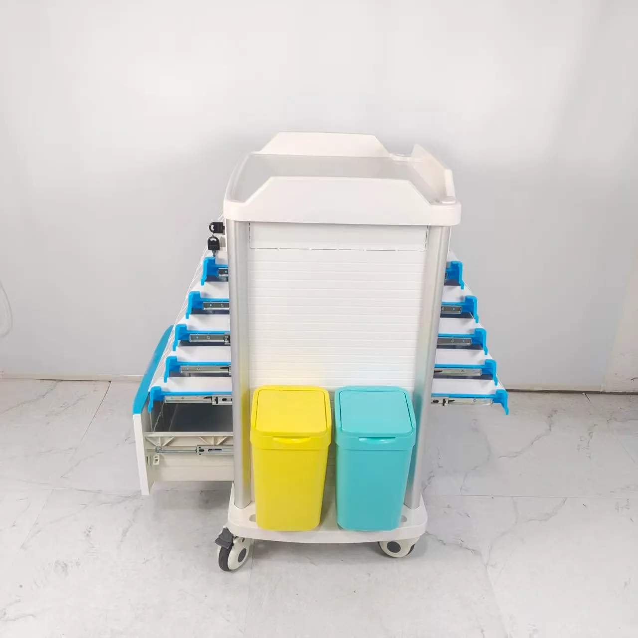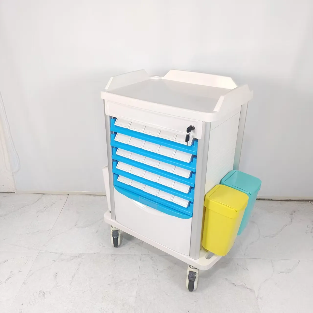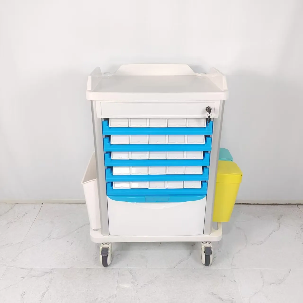 • ตะกร้าเก็บฝุ่น: ตะกร้าเก็บฝุ่นของรถเข็นดมยาสลบได้รับการออกแบบด้วยความรอบคอบและใช้งานได้จริง โดยผสมผสานสองสีที่แตกต่างกันเพื่ออำนวยความสะดวกในการคัดแยกขยะทางการแพทย์ การออกแบบที่ใช้งานง่ายนี้ช่วยให้สามารถแยกขยะได้อย่างมีประสิทธิภาพ ทำให้เกิดสภาพแวดล้อมที่ถูกสุขลักษณะและเป็นระเบียบภายในสถานพยาบาล การใช้รหัสสีช่วยให้ผู้เชี่ยวชาญด้านสุขภาพสามารถแยกแยะระหว่างขยะประเภทต่างๆ ได้อย่างง่ายดาย ช่วยให้มั่นใจได้ถึงแนวทางปฏิบัติในการกำจัดที่เหมาะสมและการปฏิบัติตามกฎระเบียบด้านการจัดการขยะ คุณลักษณะนี้แสดงให้เห็นถึงความมุ่งมั่นในการส่งเสริมสภาพแวดล้อมการทำงานที่ปลอดภัยและสะอาด ซึ่งสอดคล้องกับมาตรฐานระดับสูงด้านสุขอนามัยและการจัดการของเสียในสถานพยาบาล