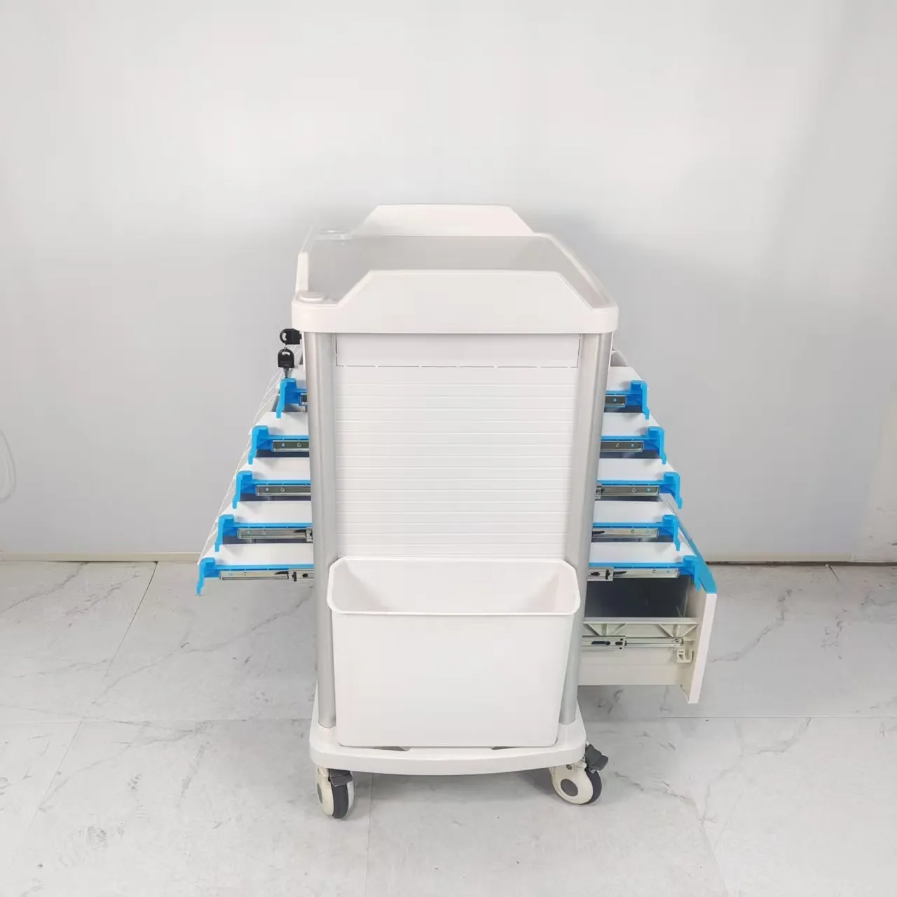 • ลิ้นชักพร้อมการ์ดฉลาก: การรวมลิ้นชักขนาดเล็ก 2 ลิ้นชัก กลาง 2 ลิ้นชัก และขนาดใหญ่ 1 ลิ้นชักเข้าด้วยกัน ทำให้มีความจุในการจัดเก็บที่หลากหลายเพื่อรองรับเครื่องมือและเวชภัณฑ์ทางการแพทย์ที่หลากหลาย ตัวแบ่งขนาดที่กำหนดเองภายในลิ้นชักช่วยให้สามารถแยกสิ่งของตามขนาด หมวดหมู่ หรือความถี่ในการใช้งาน ช่วยให้จัดระเบียบอย่างเป็นระบบและเข้าถึงได้ง่าย นอกจากนี้ ข้อกำหนดในการใส่ข้อมูลในรูปแบบแผ่นพลาสติกภายในส่วนตัวเรือนของลิ้นชักช่วยให้สามารถติดฉลากได้ชัดเจน ช่วยให้มั่นใจได้ถึงการจัดการสินค้าคงคลังที่มีประสิทธิภาพและการระบุเนื้อหาได้อย่างรวดเร็ว ซึ่งท้ายที่สุดแล้ว มีส่วนช่วยให้กระบวนการทางการแพทย์และการดูแลผู้ป่วยเป็นไปอย่างราบรื่นในท้ายที่สุด