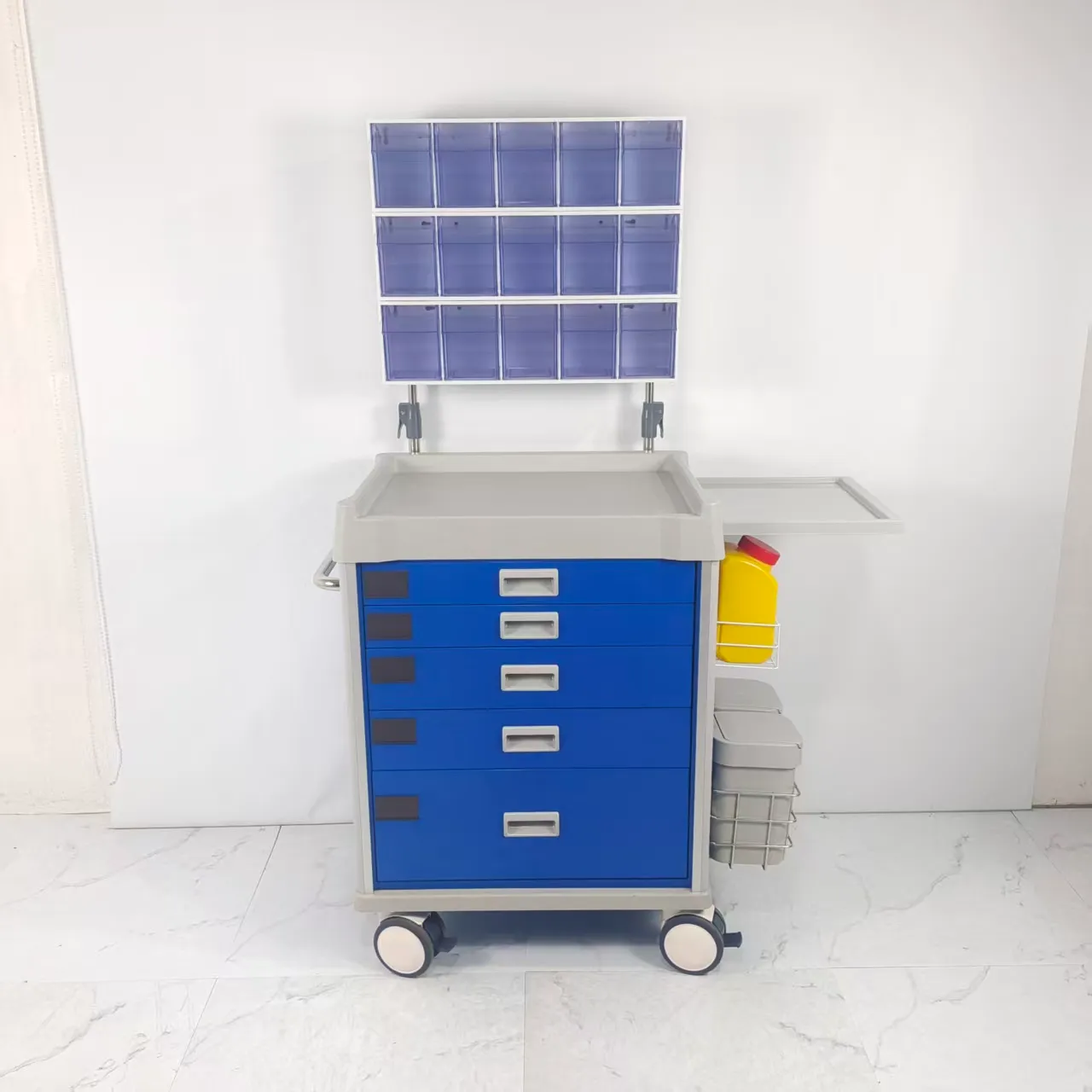 - Hộp lưu trữ: Xe đẩy gây mê bao gồm một lớp gồm năm hộp lưu trữ, mỗi hộp có bề ngoài trong suốt giúp dễ dàng nhận dạng trực quan các vật dụng bên trong. Yếu tố thiết kế này hợp lý hóa việc quản lý hàng tồn kho và thúc đẩy khả năng tiếp cận hiệu quả các nguồn cung cấp cần thiết trong cơ sở y tế. Hơn nữa, giá đỡ của hộp lưu trữ có thể điều chỉnh độ cao và có thể tháo rời, nâng cao tính linh hoạt và tùy chỉnh dựa trên nhu cầu lưu trữ cụ thể. Tính năng này cho phép các chuyên gia chăm sóc sức khỏe điều chỉnh cấu hình lưu trữ để phù hợp với các kích cỡ khác nhau của vật phẩm, thúc đẩy việc tổ chức và khả năng tiếp cận trong xe đẩy thuốc mê.