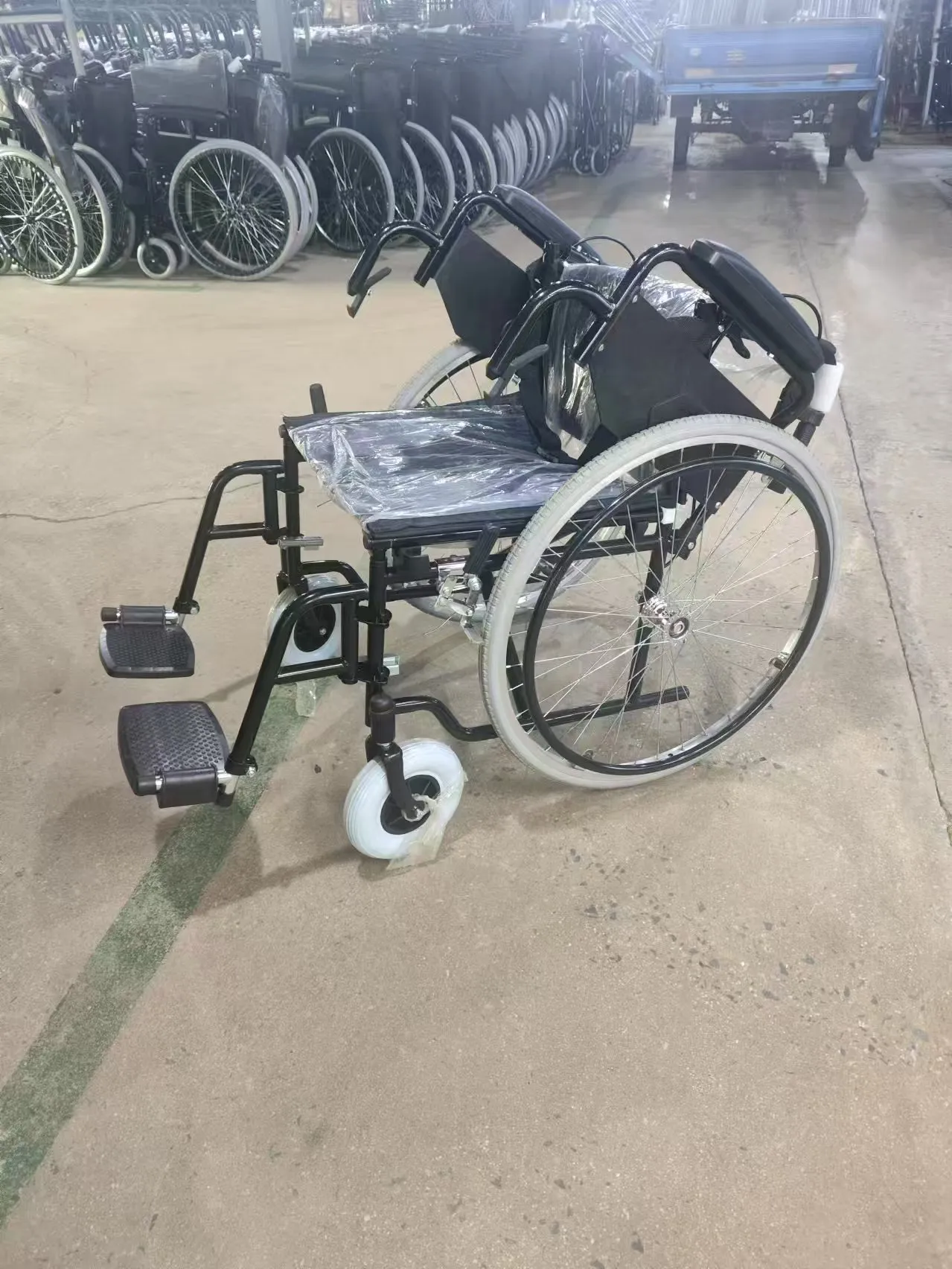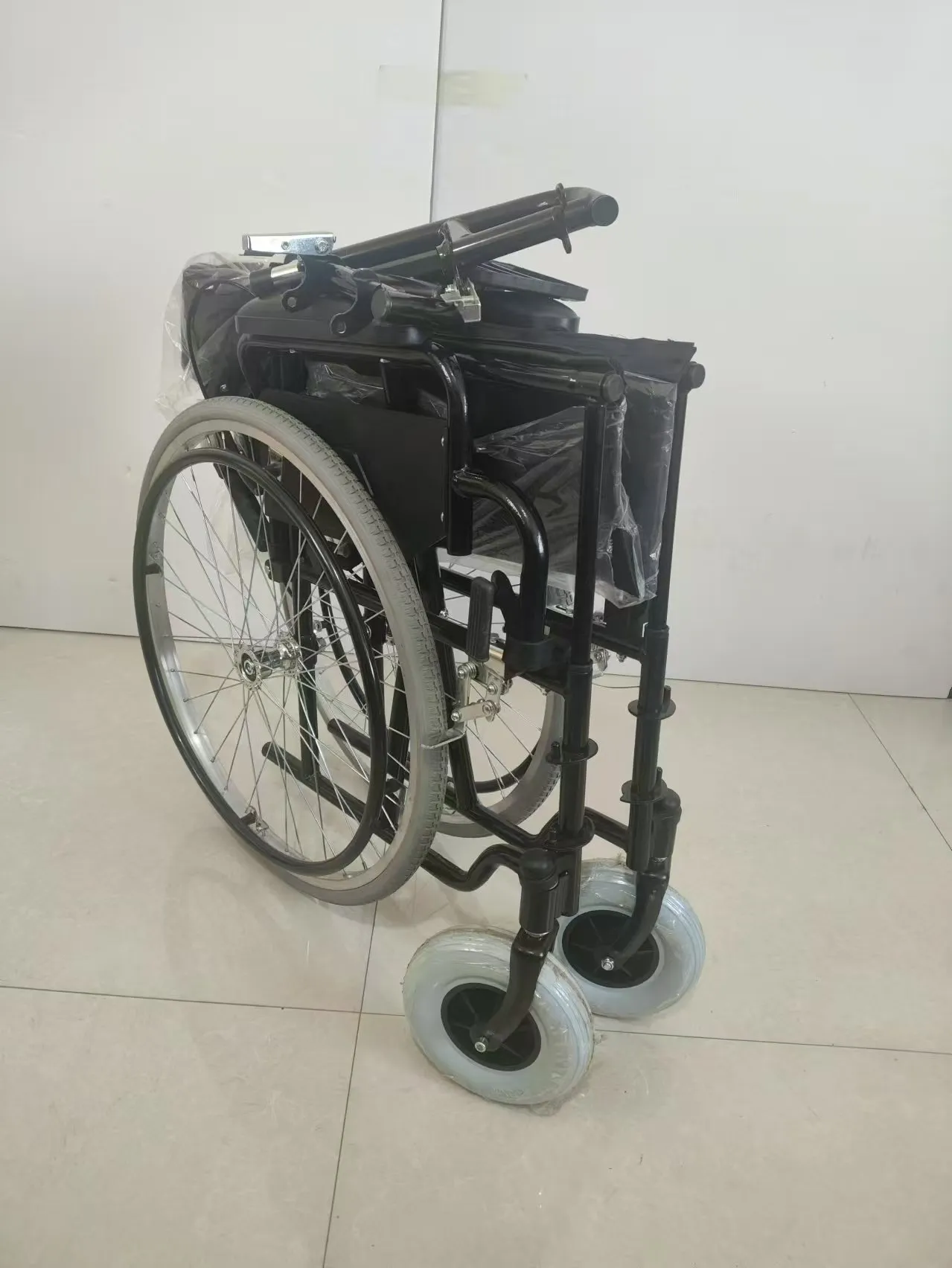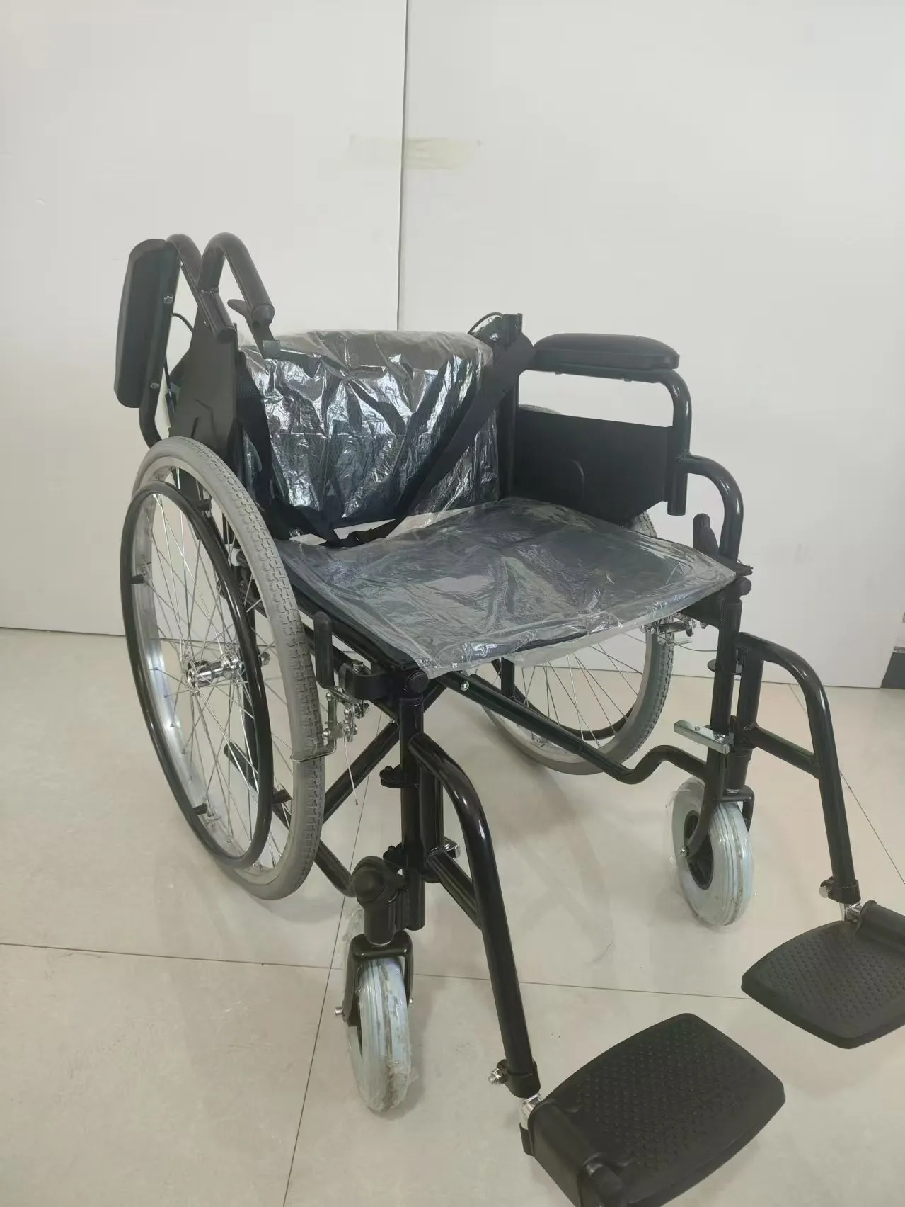 Đặc điểm: Khung màu đen, tựa lưng gập, chân trước có thể tháo rời, tựa tay lật, chắn bùn đúc phun với tựa tay bằng da xốp cao cấp, tay vịn bằng kim loại, bàn đạp nhựa có thể điều chỉnh và cấu trúc đỡ một thanh.